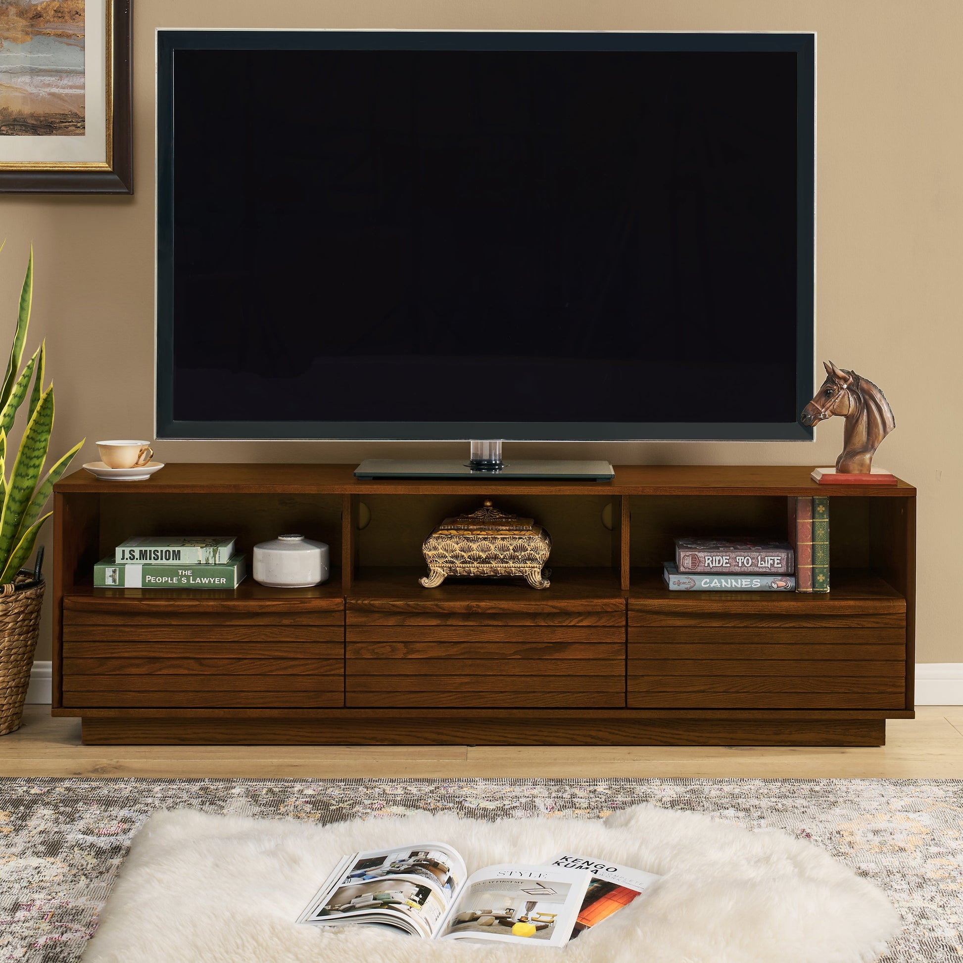 63' Mid-Century Modern TV Stand for TVs up to 75', Thick Sturdy Farmhouse Entertainment Cabinet, Media Console for Living Room, Louver Design & Solid Wood Drawers & Outlet Holes, Walnut