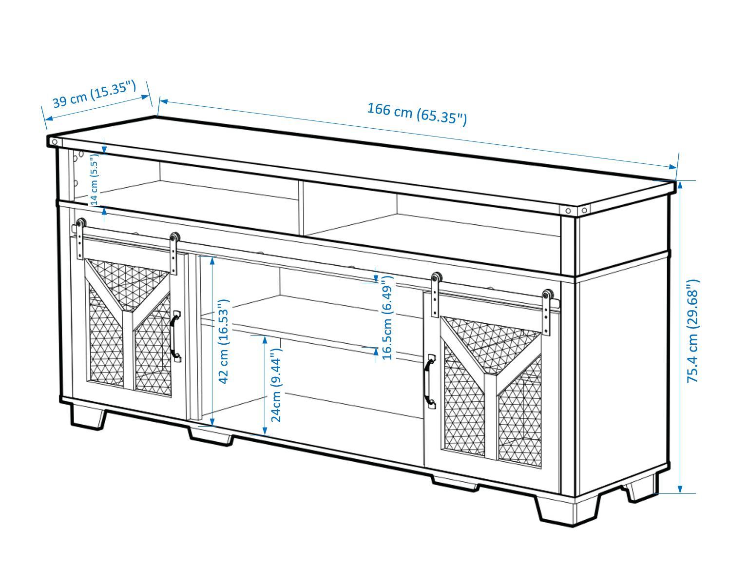 - Unique Rustic Aesthetic:This TV stand is a perfect addition to any home with a penchant for country - style decor. The charming country gray finish exudes a warm and inviting atmosphere, instantly transforming your living space. Sliding barn doors with inset metal mesh and dark iron-tone hardware not only not only provide a practical storage solution but also add a touch of rustic elegance, reminiscent of classic barns in the countryside.