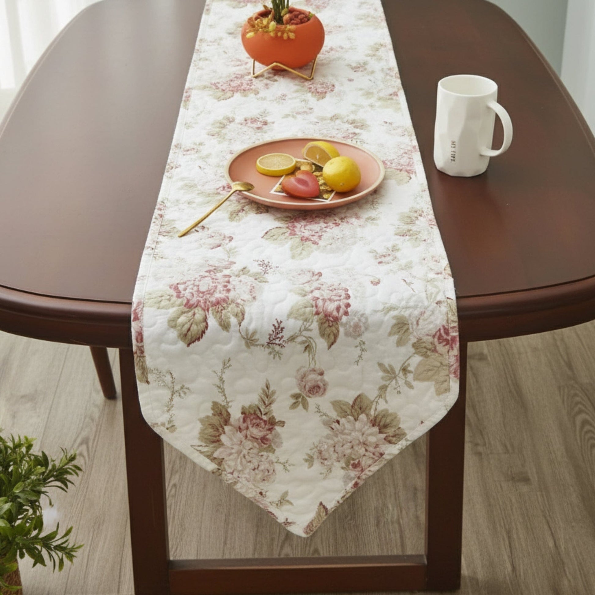 Lovingly crafted with a soft, quilted texture, it not only protects your surfaces but also adds a layer of sophisticated style. The unique pointed ends create a graceful drape, making it a standout piece on any table. Whether you're hosting a festive brunch, a holiday dinner, or simply enjoying a quiet cup of tea, this runner creates a warm and inviting atmosphere.