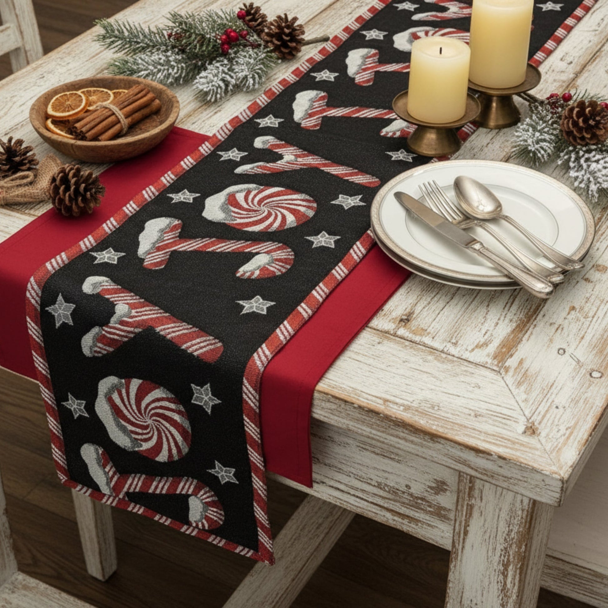 A merry mix of peppermint candy canes and joy, this runner is a festive flair master, turning your table into a holiday spectacle!