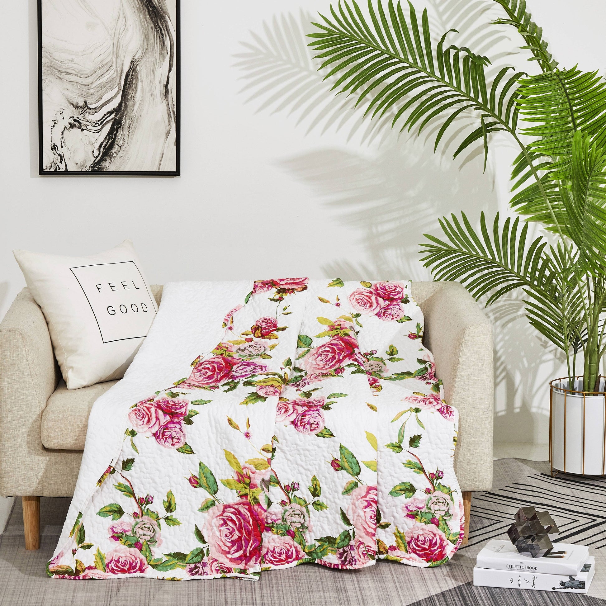 This throw showcases a stunning floral design featuring blooming roses in a range of soft pinks and blush tones, bringing the essence of a flourishing garden indoors. The vivid floral patterns are beautifully contrasted against a clean, crisp white background, creating a fresh, harmonious look that adds a touch of nature to your space. The thoughtfully curated color palette effortlessly complements a variety of interiors, making it ideal for both neutral-toned spaces and more vibrant decor settings. Whether placed in your bedroom, living room, or reading nook, this throw enhances the aesthetic of any room with its versatile and timeless design.