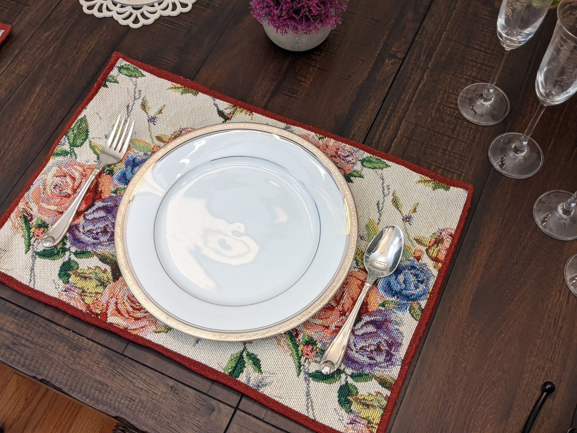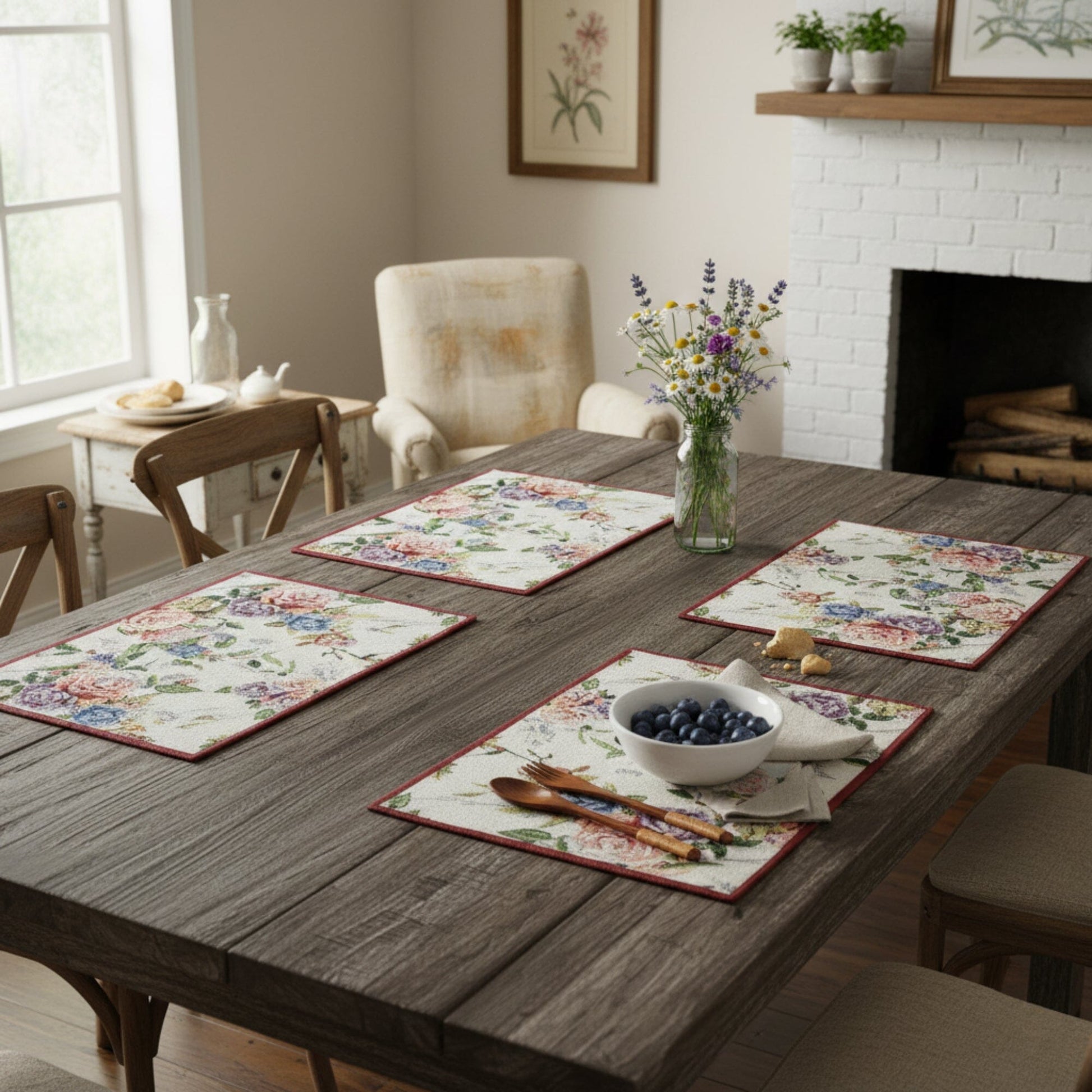 This set includes four matching placemats, allowing you to create a beautifully coordinated table setting that exudes charm and elegance. Perfect for entertaining guests or adding a touch of floral flair to everyday dining.
