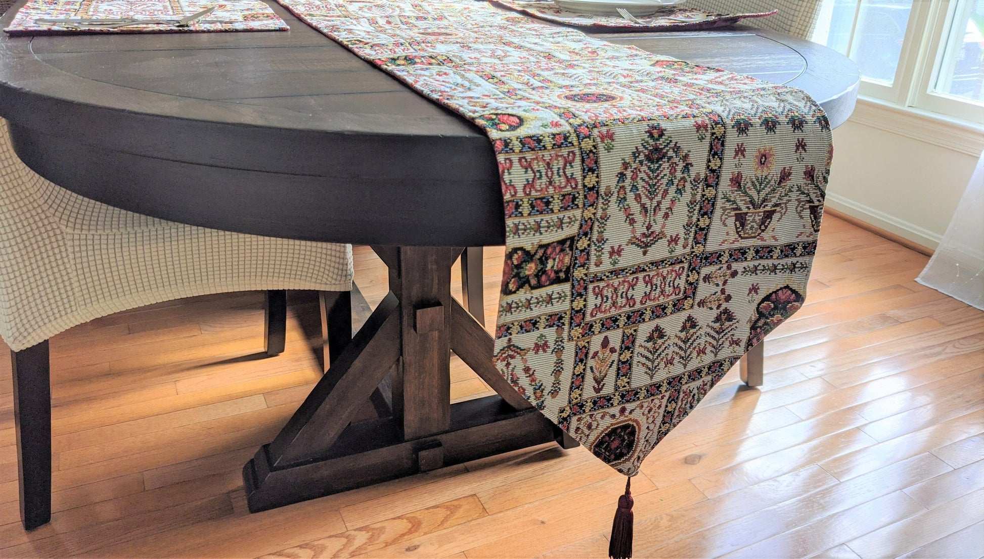 - Table runner comes with a decorative shiny red tassel on each end giving it an elegant touch.