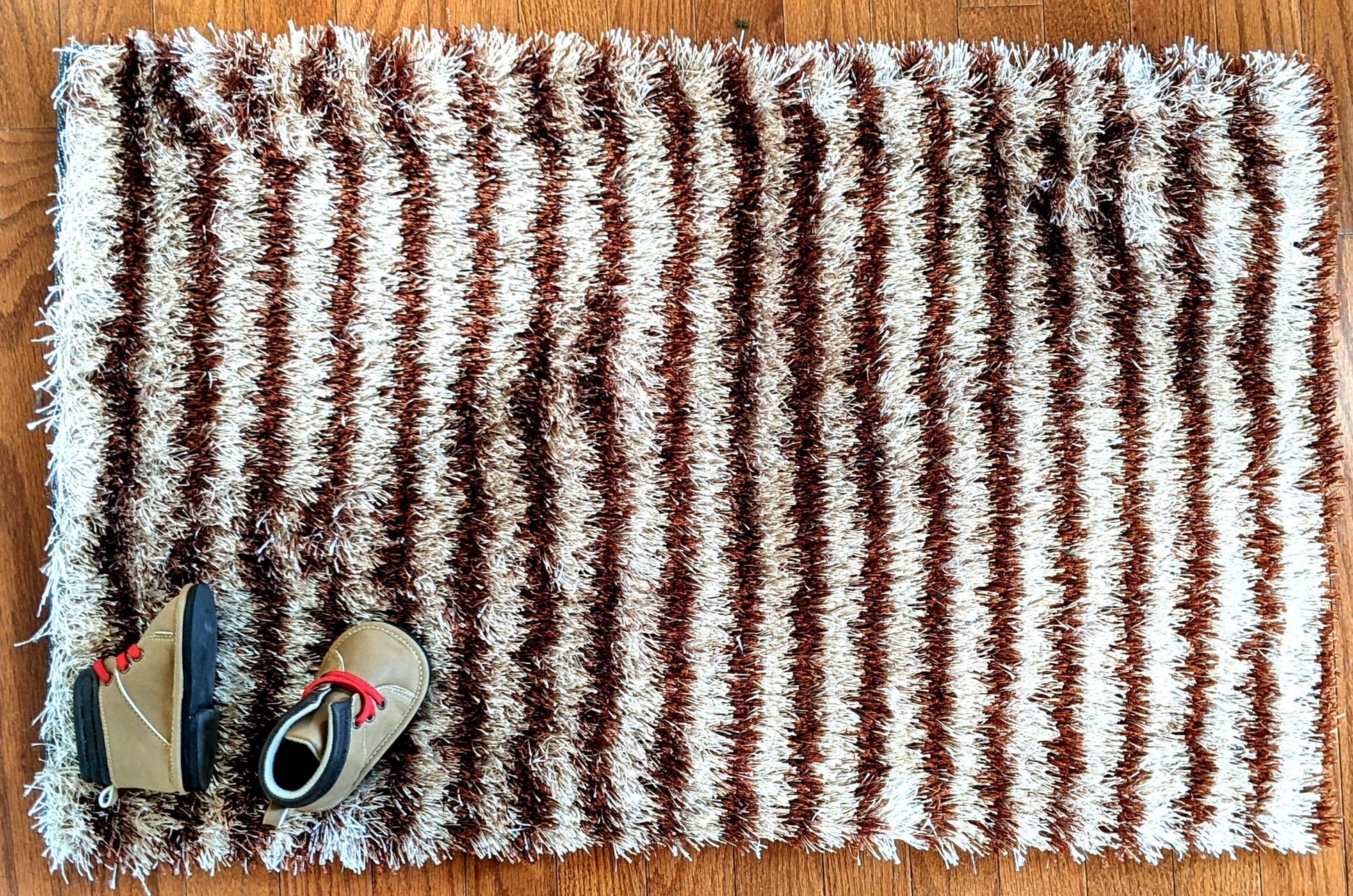 Plush plus soft magical light beige and dark brown striped small rug - measured at 20" W x 32" L.