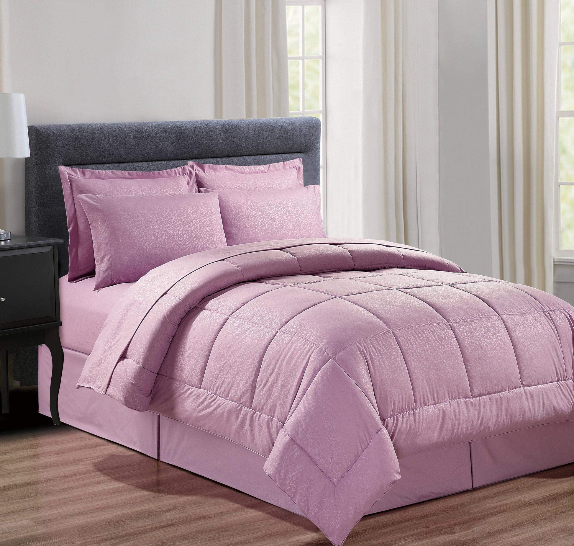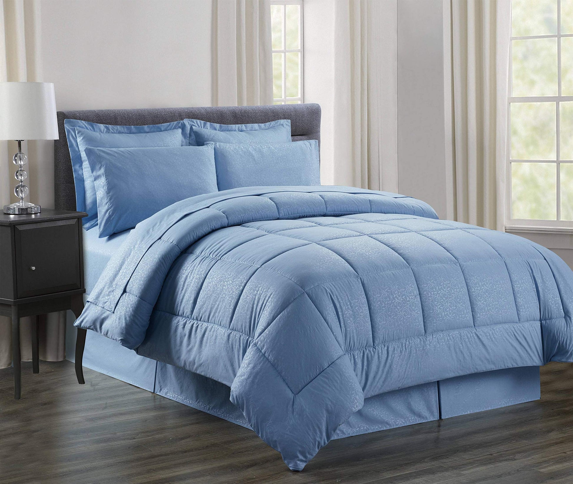 Update the look and feel of your bedroom or guest room with this down alternative comforter set! Extra soft microfiber, 8 piece set includes 1 comforter, 1 bedskirt, 2 pillow shams, and a 4 piece sheet set.