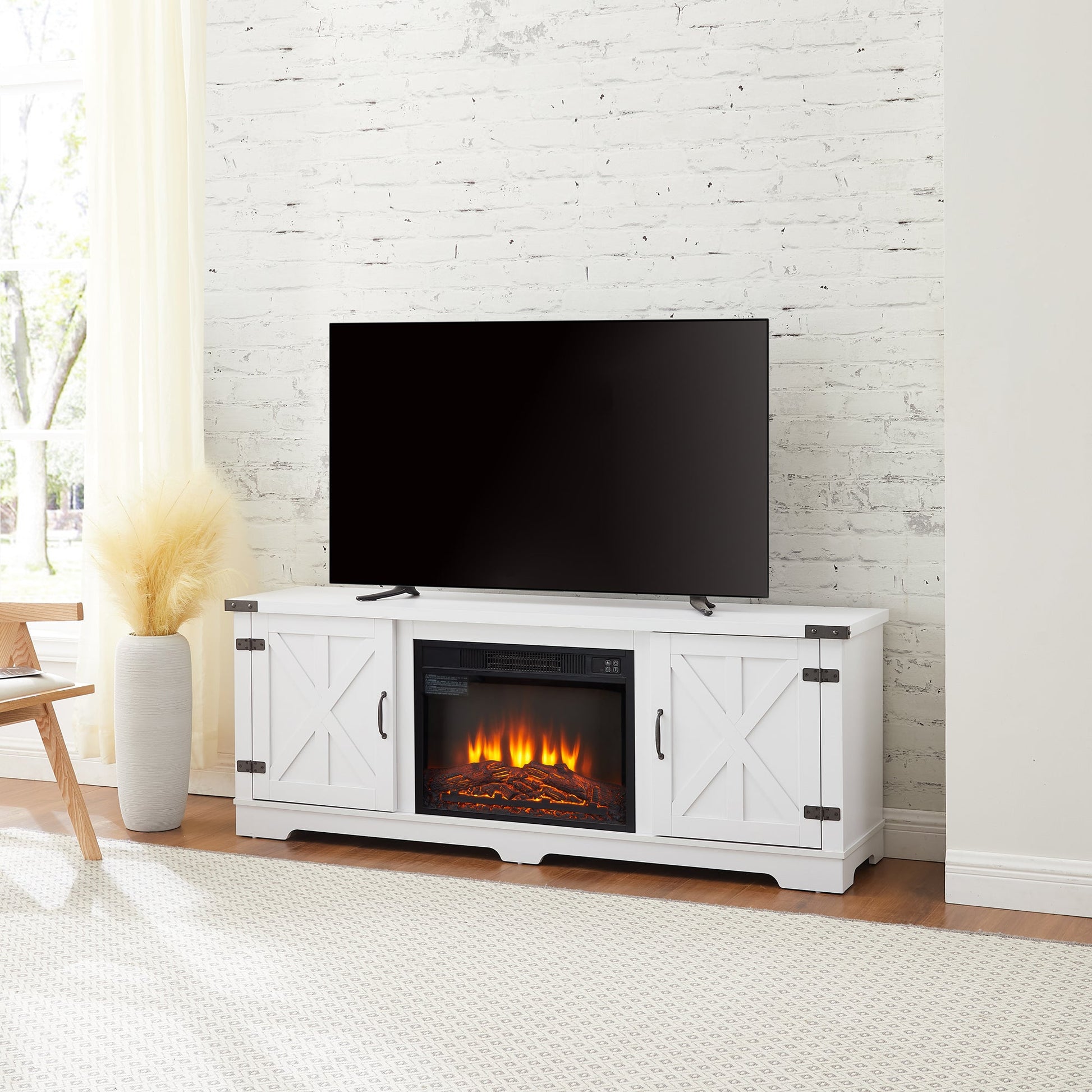 Modern Farmhouse TV Media Stand, Large Barn Inspired Home Entertainment Console, with 23' Fireplace Insert, for TV Up to 70'', with Open Shelves and Closed Cabinets, White, 64.8'W*15.67'D*24.29'H