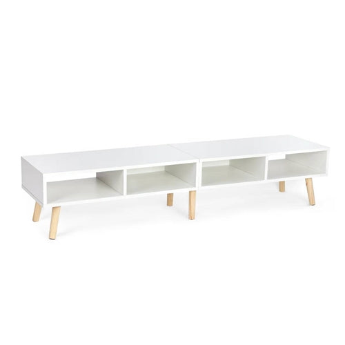Do you enjoy watching movies with family in the living room, playing video games with friends in the game room, or having a quiet film night in bed with a meal tray? This Modern Mid-Century Style TV Stand in White with Wood Legs for TVs up to 65-inch is designed to complement your favorite leisure activities. It features a simple and minimalist design with four open shelves for storage and display, allowing you to organize your media devices and collections. The classic color design ensures it will seamlessly match your existing furniture, while the sturdy structure and cord management feature provide practical functionality. Crafted from durable particleboard, this piece of furniture will be a reliable companion for years to come, allowing you to enjoy your favorite series in comfort.