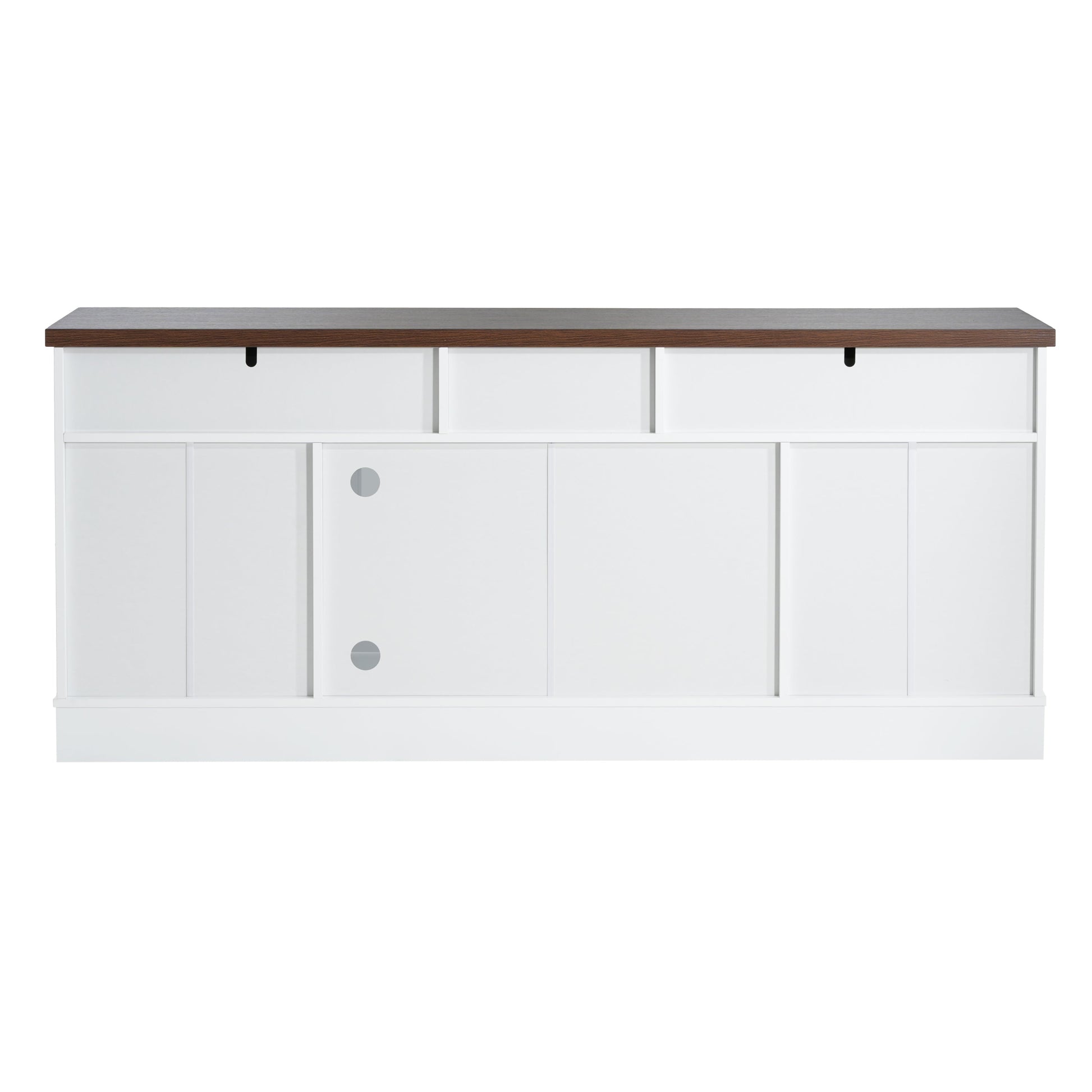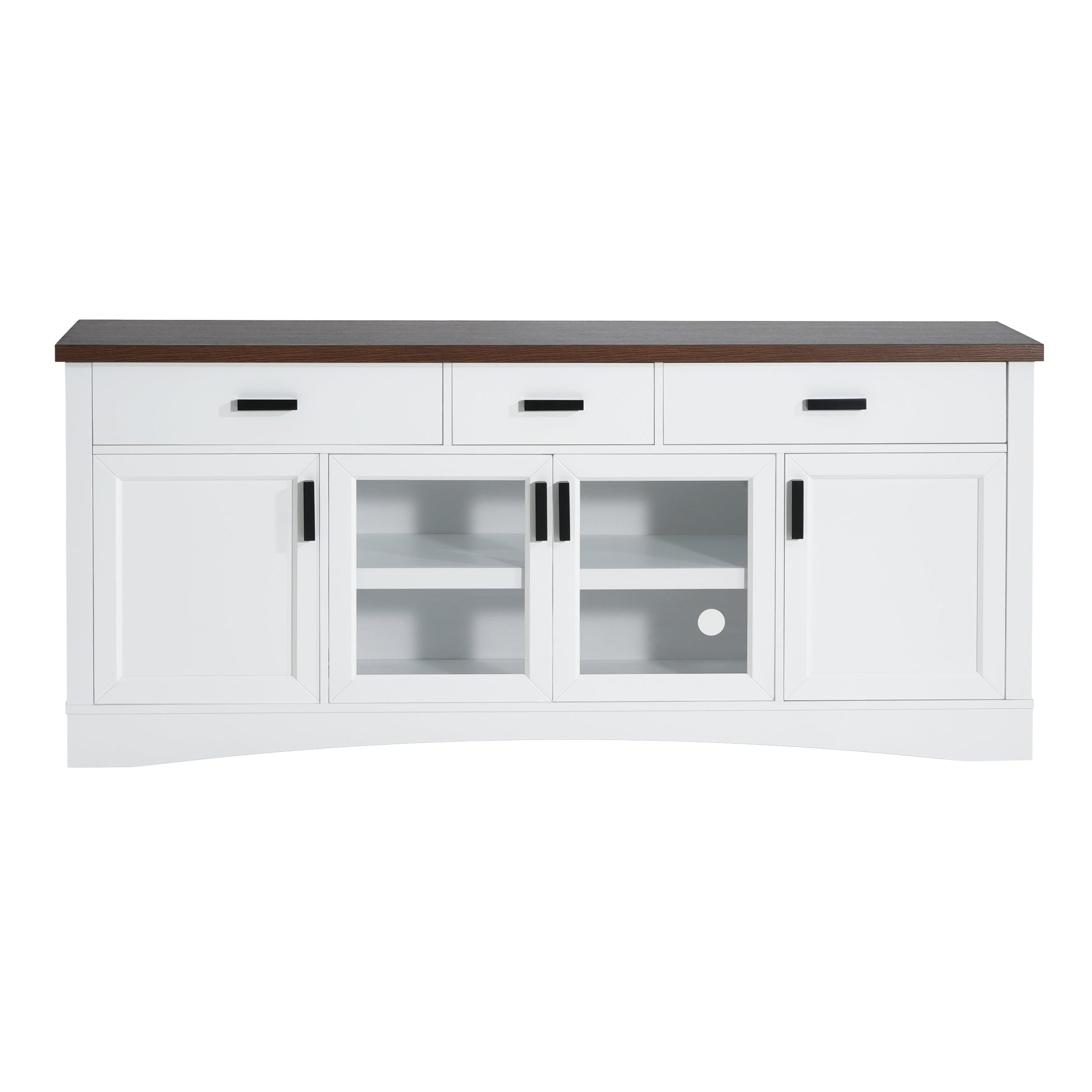 This TV Stand, crafted from durable manufactured wood, measures 67'W * 15.5'D * 29.25'H. It features a stylish design with a white body and a walnut top, fitting most home decor. The 4-door (with two middle glass doors) and 3-drawer structure, plus 3 storage spaces with adjustable shelves (in 3 height options), offers versatile storage. You can organize media devices, books, and small items neatly. Assembly is required, but clear steps help. It’s a perfect blend of style and functionality for your living room.