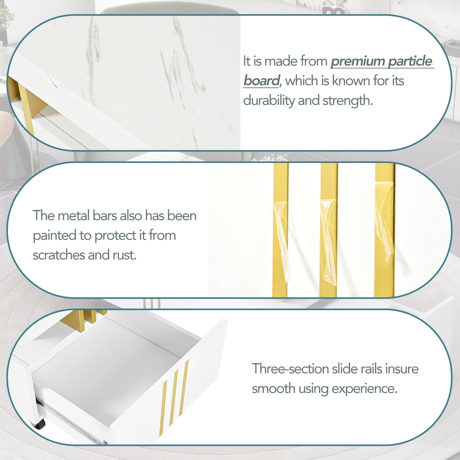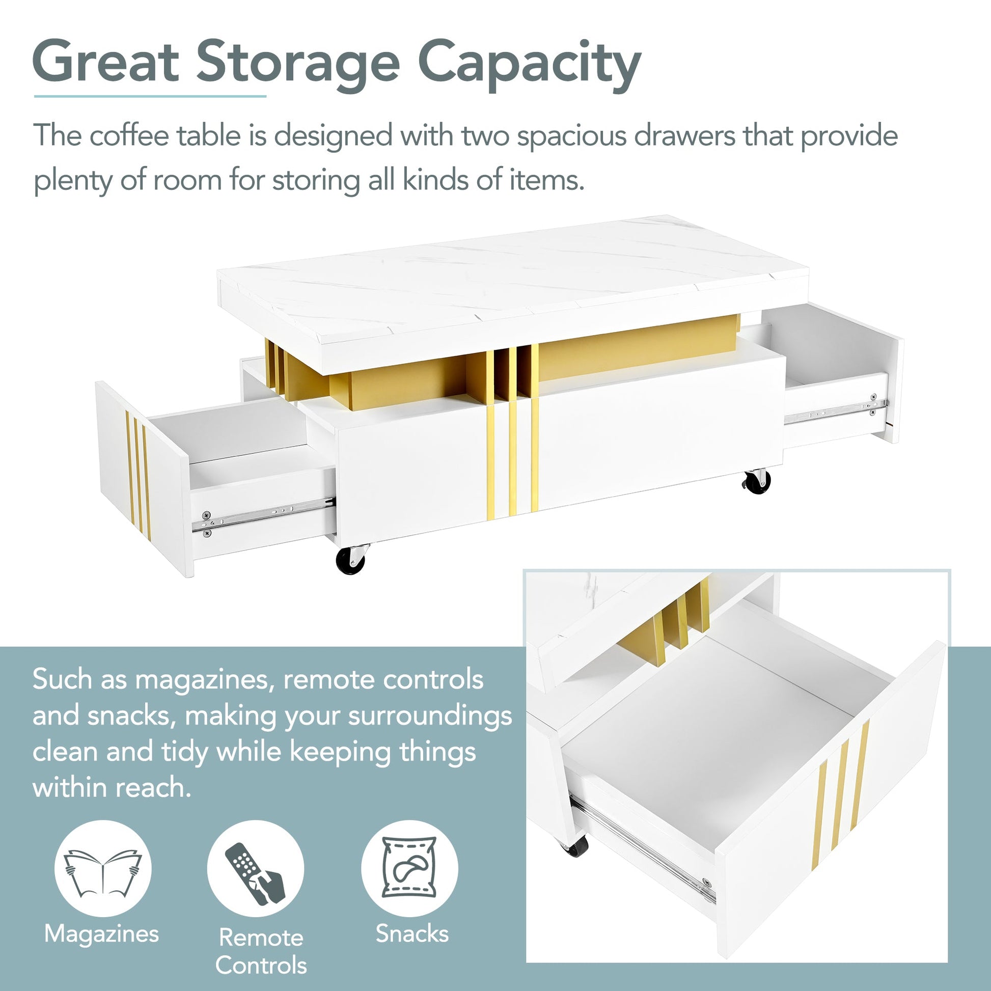 ON-TREND Contemporary Coffee Table with Faux Marble Top, Rectangle Cocktail Table with Caster Wheels, Moderate Luxury Center Table with Gold Metal Bars for Living Room, White