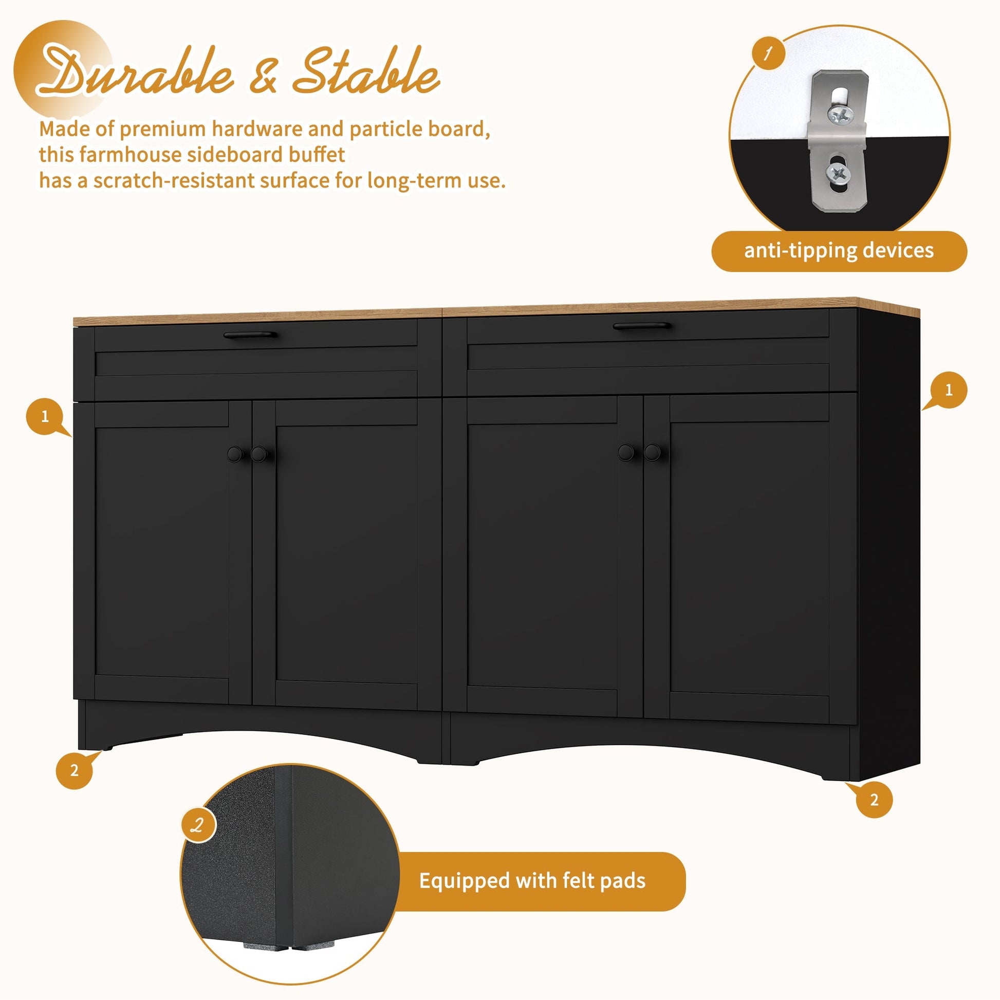 - Durable & Stable: Made of premium hardware and particle board, this farmhouse sideboard buffet has a scratch-resistant surface for long-term use. Equipped with thoughtfully foot pads and robust anti-tipping devices, this product ensures safe and secure use in your daily life, giving you peace of mind.
