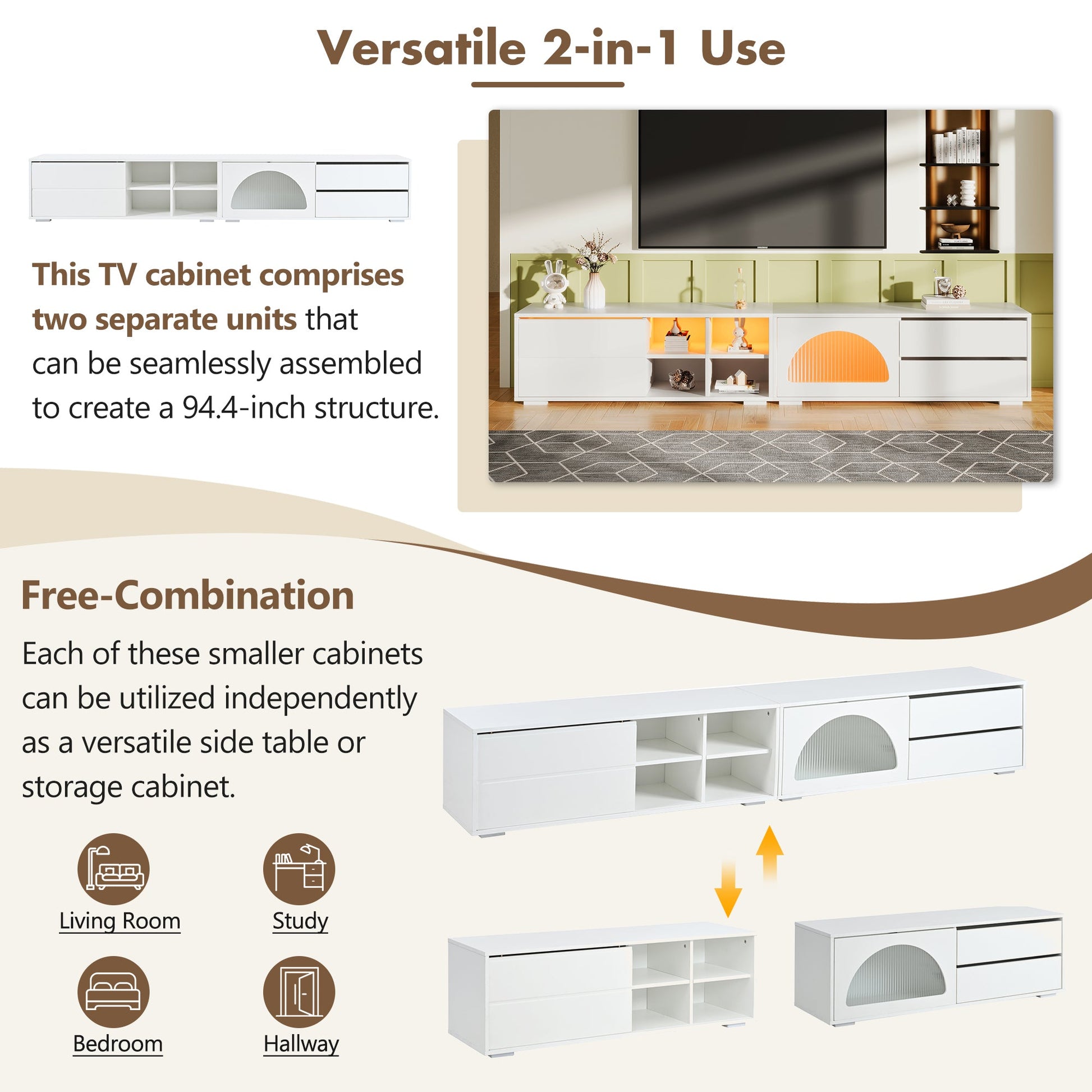 This TV cabinet comprises two separate units that can be seamlessly assembled to create a 94.4-inch structure, suited for accommodating TVs up to 100inch. Additionally, each of these smaller cabinets can be utilized independently as a versatile side table or storage cabinet, offering a multitude of placement possibilities in any area of your home, such as the living room, study, bedroom or hallway.