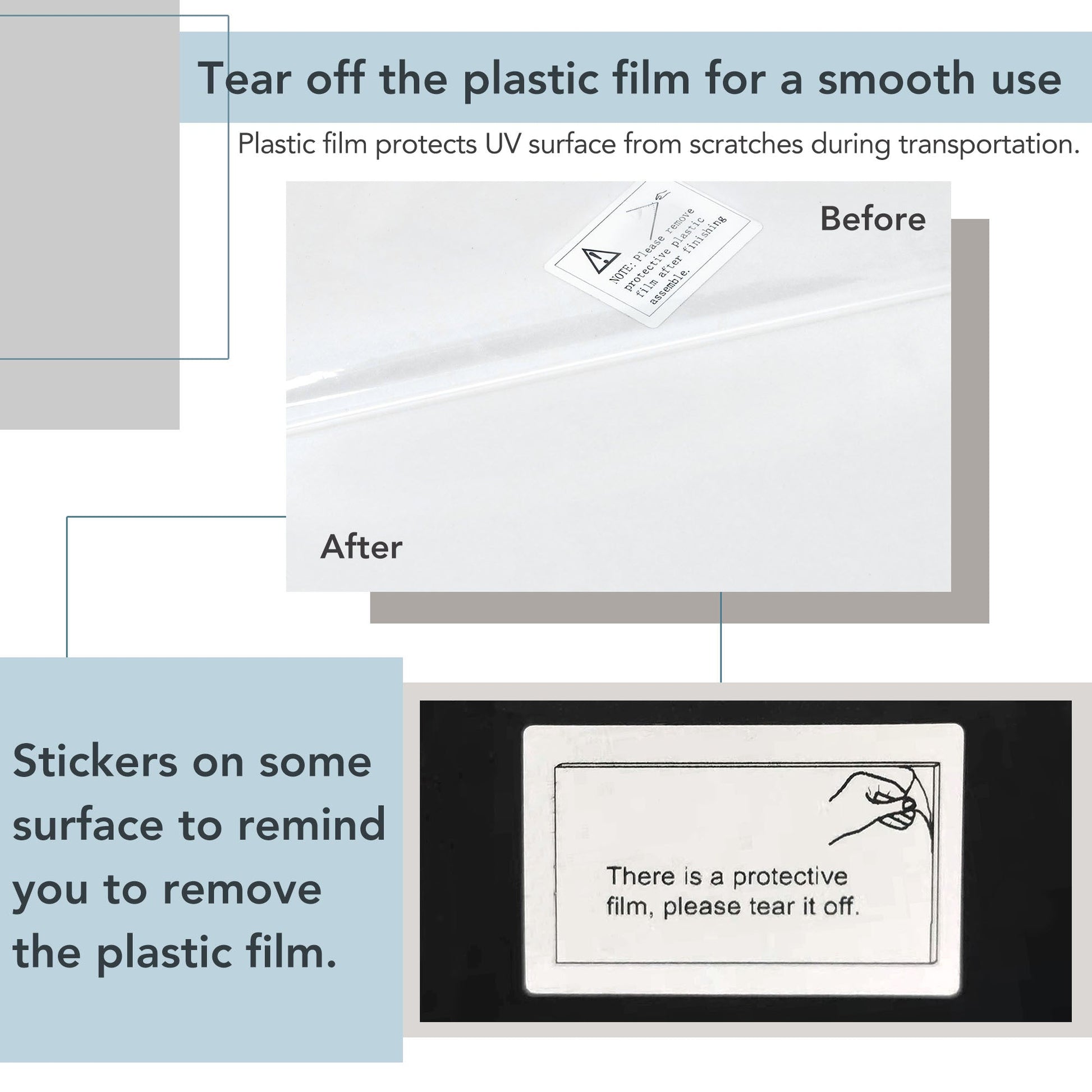 | Notice | The plastic film for protecting UV from scratches should be teared off before put into use. If there is light dust on the edge, it can be wiped with a wet rag. |