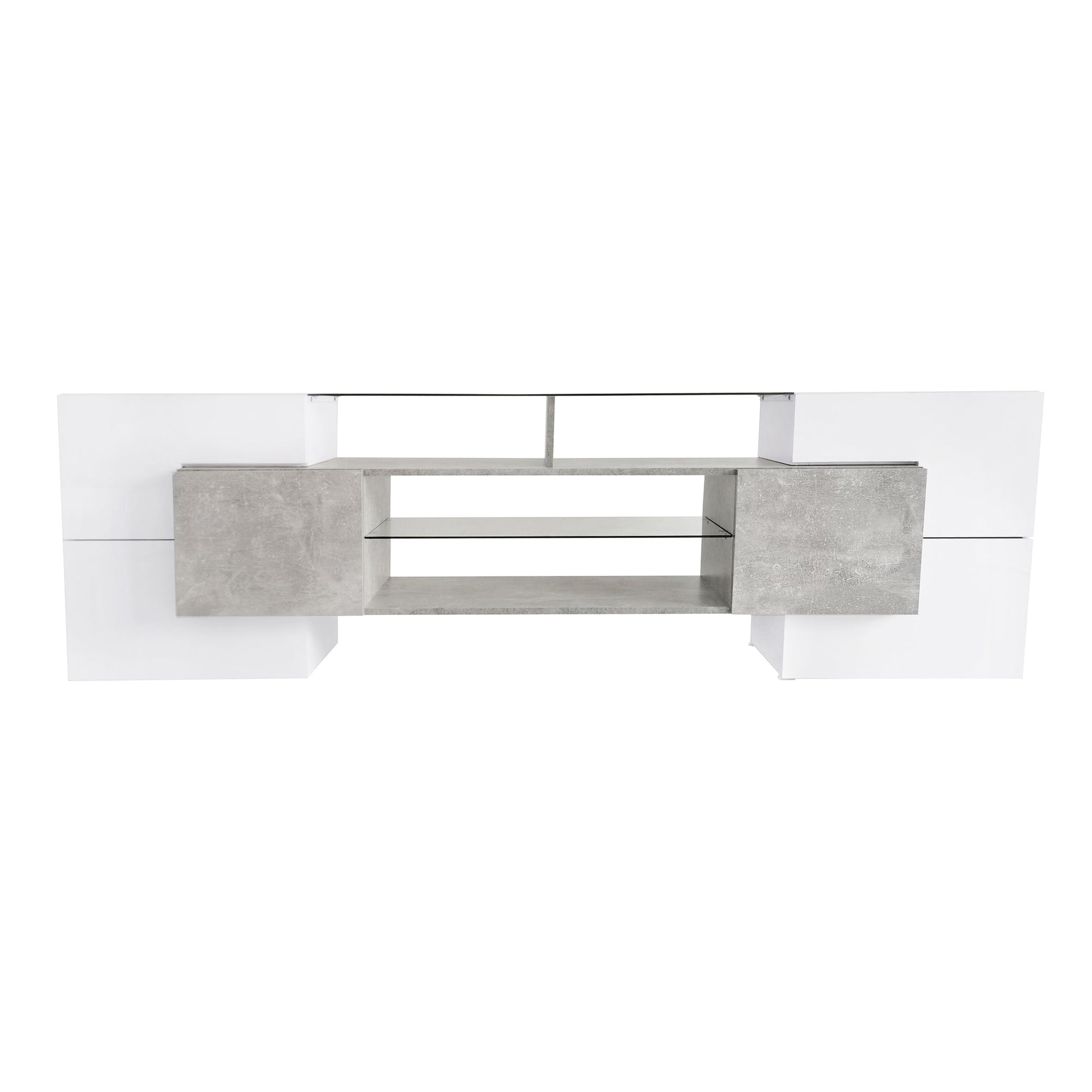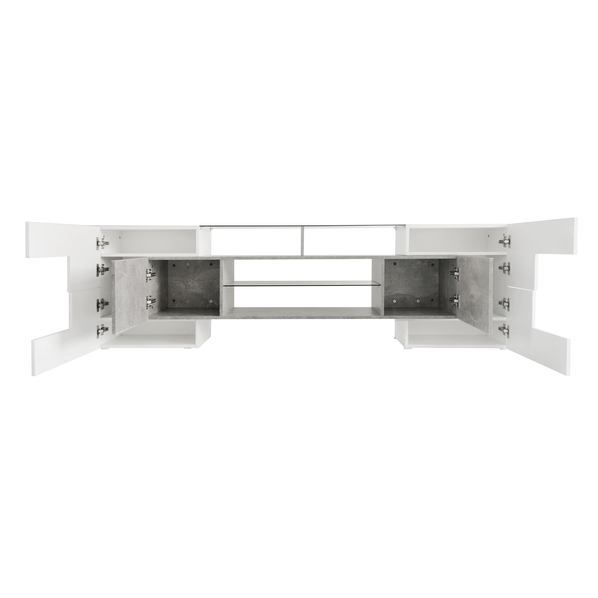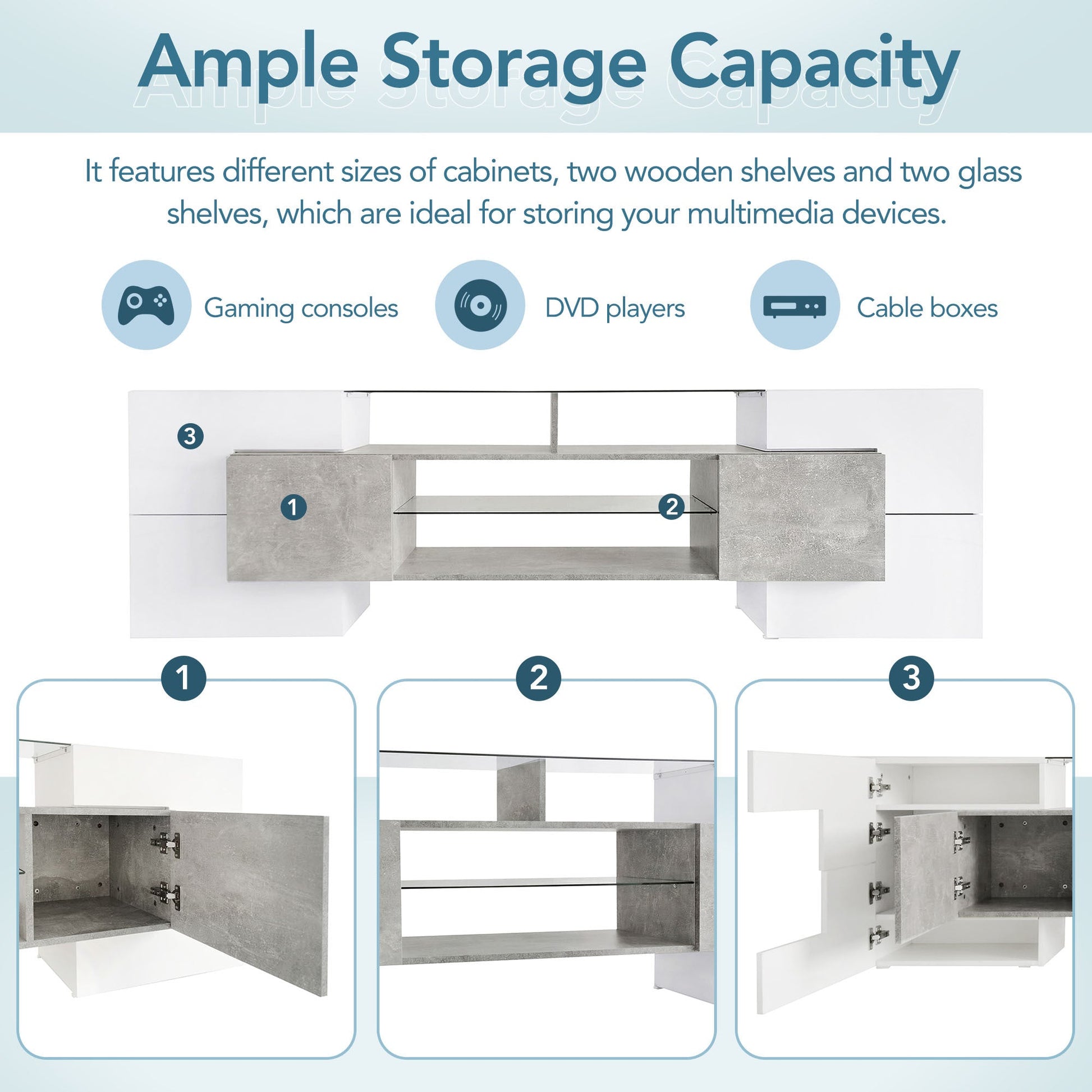 ON-TREND Unique Shape TV Stand with 2 Illuminated Glass Shelves, High Gloss Entertainment Center for TVs Up to 88', Versatile TV Cabinet with LED Color Changing Lights for Living Room, Grey
