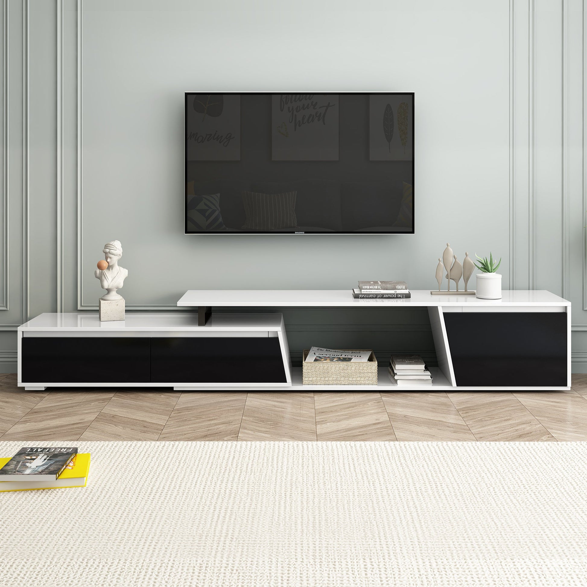 - Asymmetrical Art-Inspired Design: Drawing inspiration from asymmetrical art, this sleek and modern TV stand becomes a statement piece that adds visual interest to any living room.