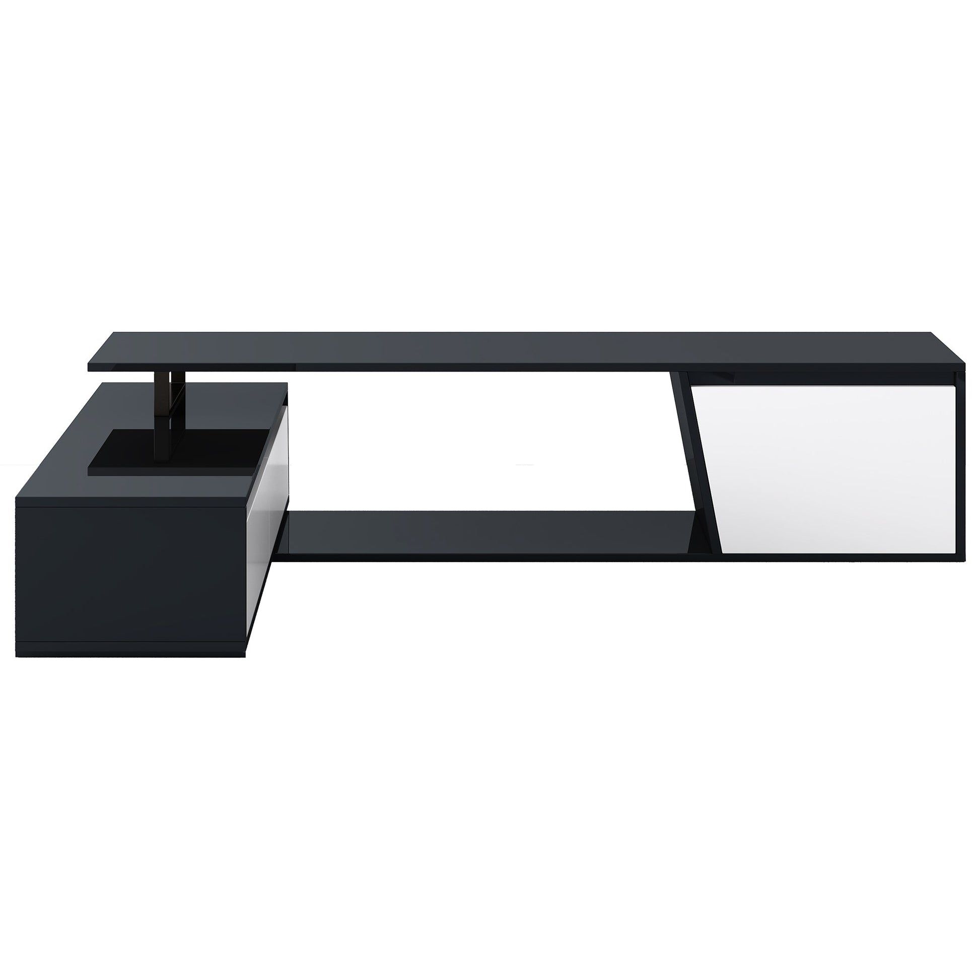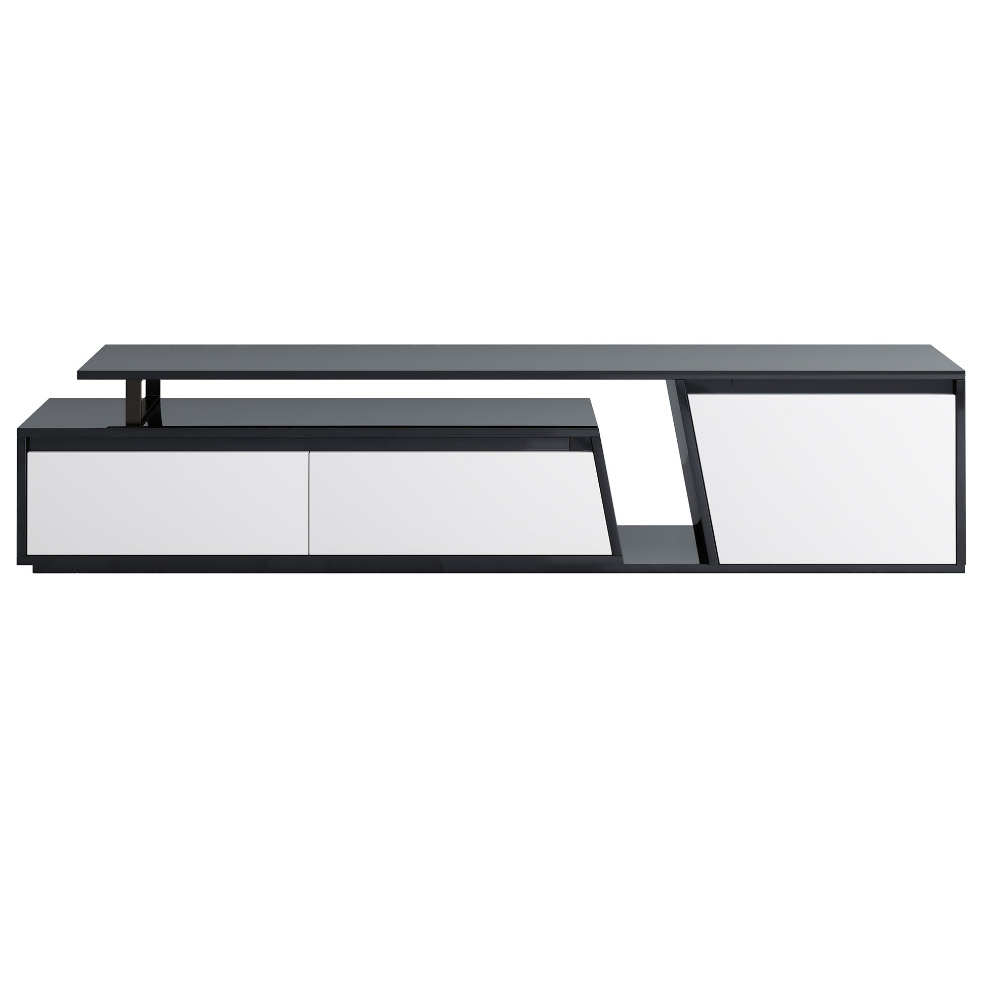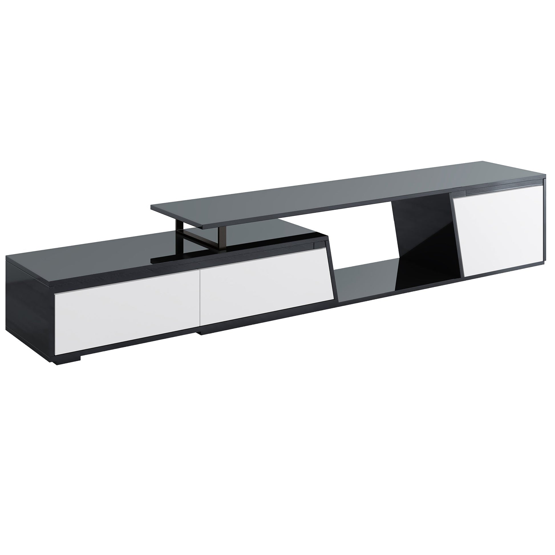 Inspired by the art of asymmetrical, this extendable contemporary TV stand is is definitely a highlight of your living room. It features two ample drawers and one cabinet to keep DVDs, magazines, blankets, toys or other essentials tidy. Made of high-quality particle board with high-glossy surface, this stylish TV is the perfect choice for your living room and bedroom. Can accommodate up to an 100-inch TV.