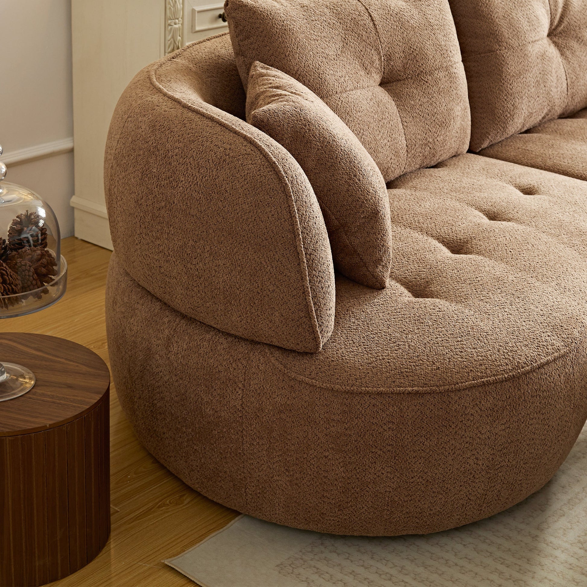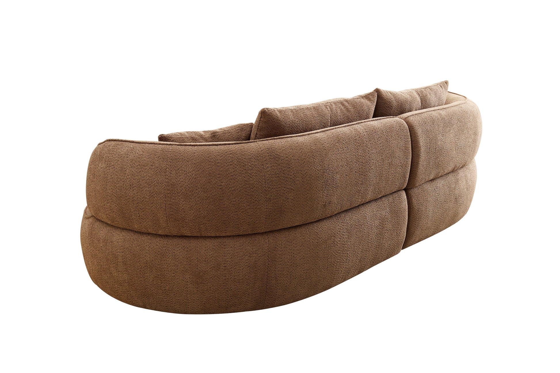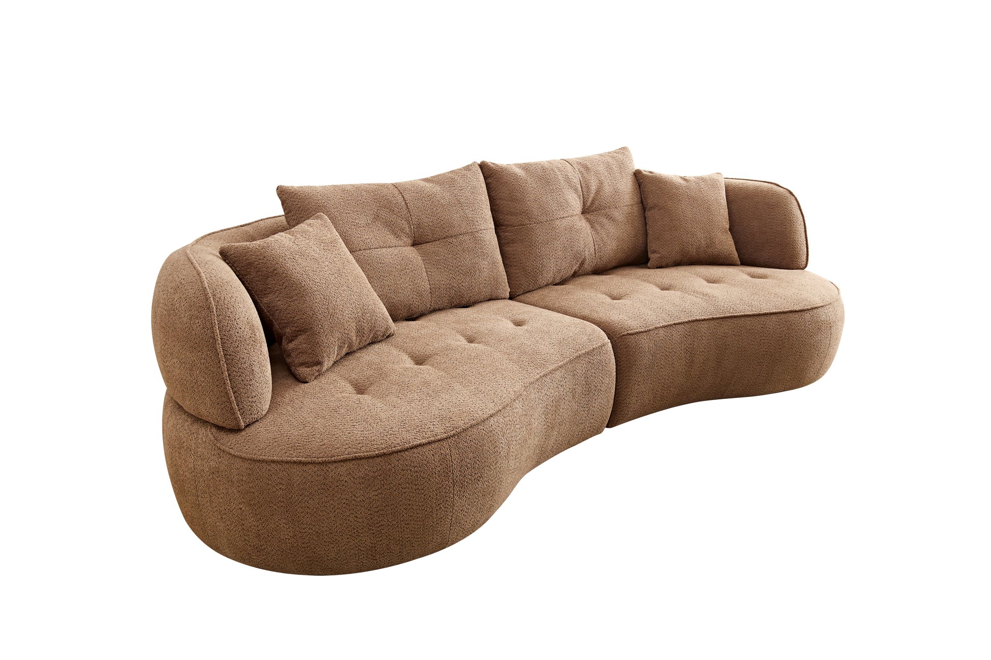Camel color combo sofa with detachable pillows, durable fabric, solid wood frame, high density sponge padding, modern style moon curve sofa has shape and comes with 4 throw pillows.